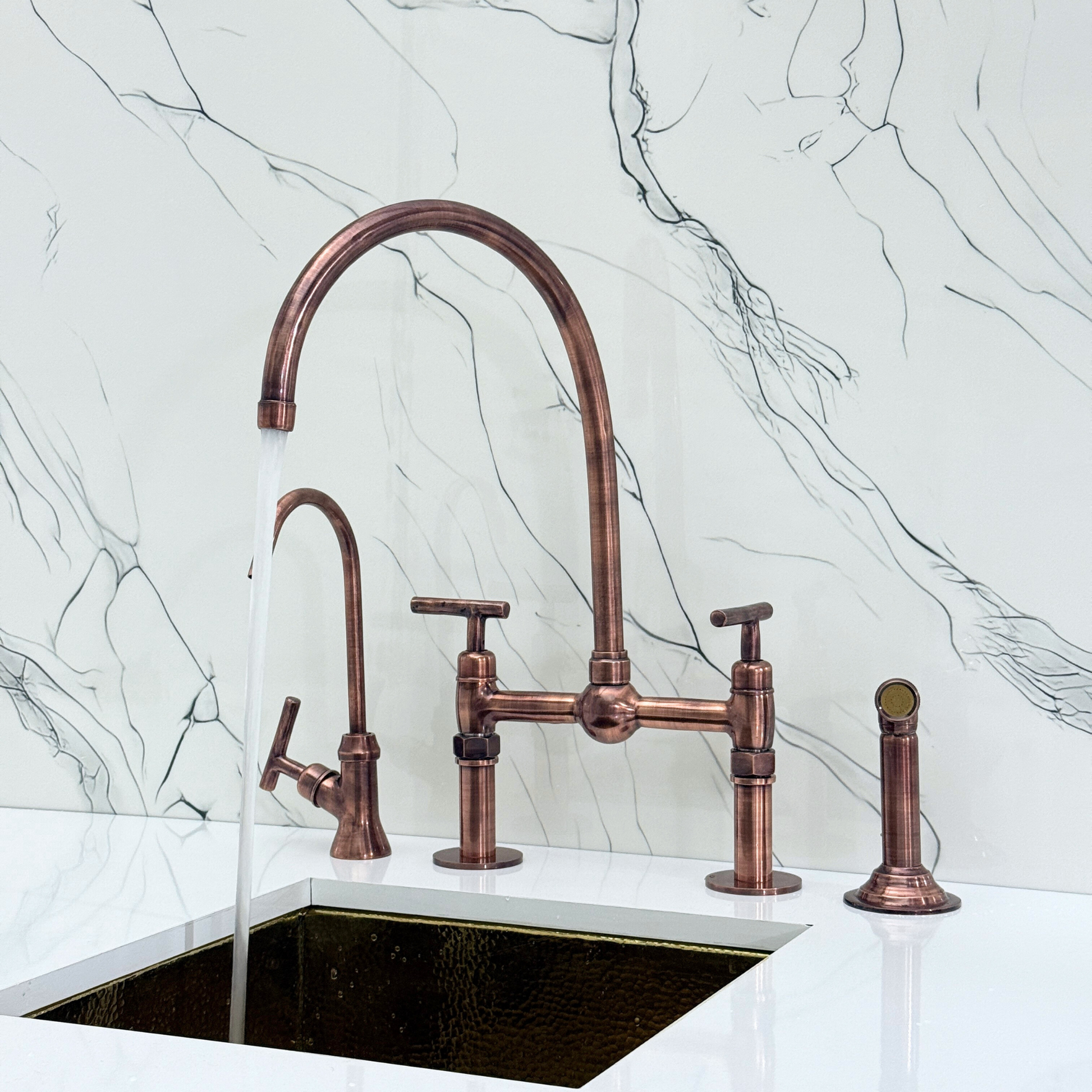 Kitchen Bridge Faucet with Ball Center in Antique Copper Finish blends traditional charm with modern utility. Featuring a striking antique copper finish over solid brass construction, it offers both durability and timeless character. The smooth ball center detail enhances visual symmetry and sophistication. A 360° swivel gooseneck spout with a 10" reach ensures full sink coverage, while the straight-leg base delivers stability and classic geometry. Designed for practical elegance, it includes a high-pressure side sprayer and a dedicated drinking water tap. Lever handles provide smooth water control, and the antique copper finish resists corrosion and elevates any kitchen aesthetic.