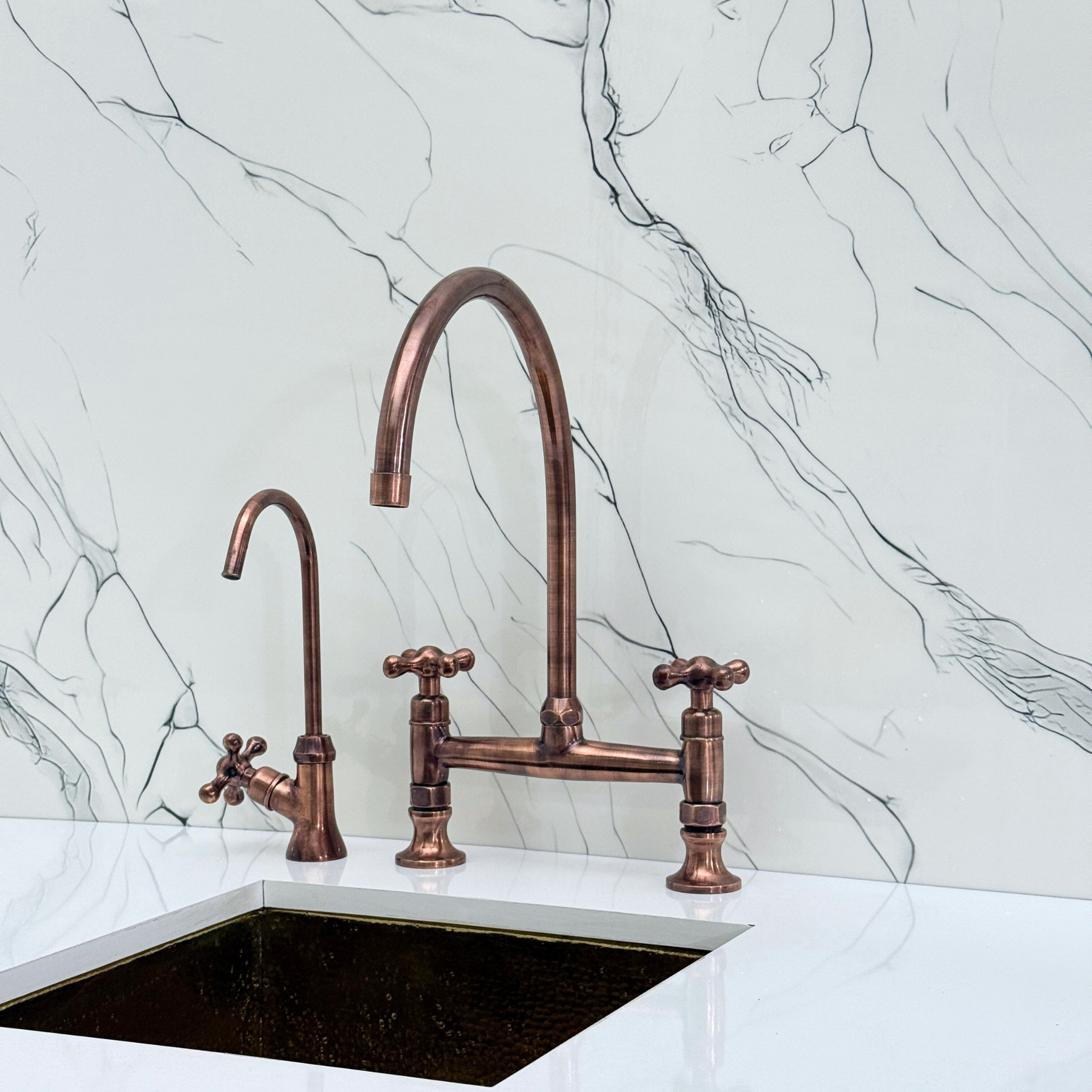 Antique Copper Bridge Kitchen Faucet with Sprayer, Drinking Water Tap and Cross Handles