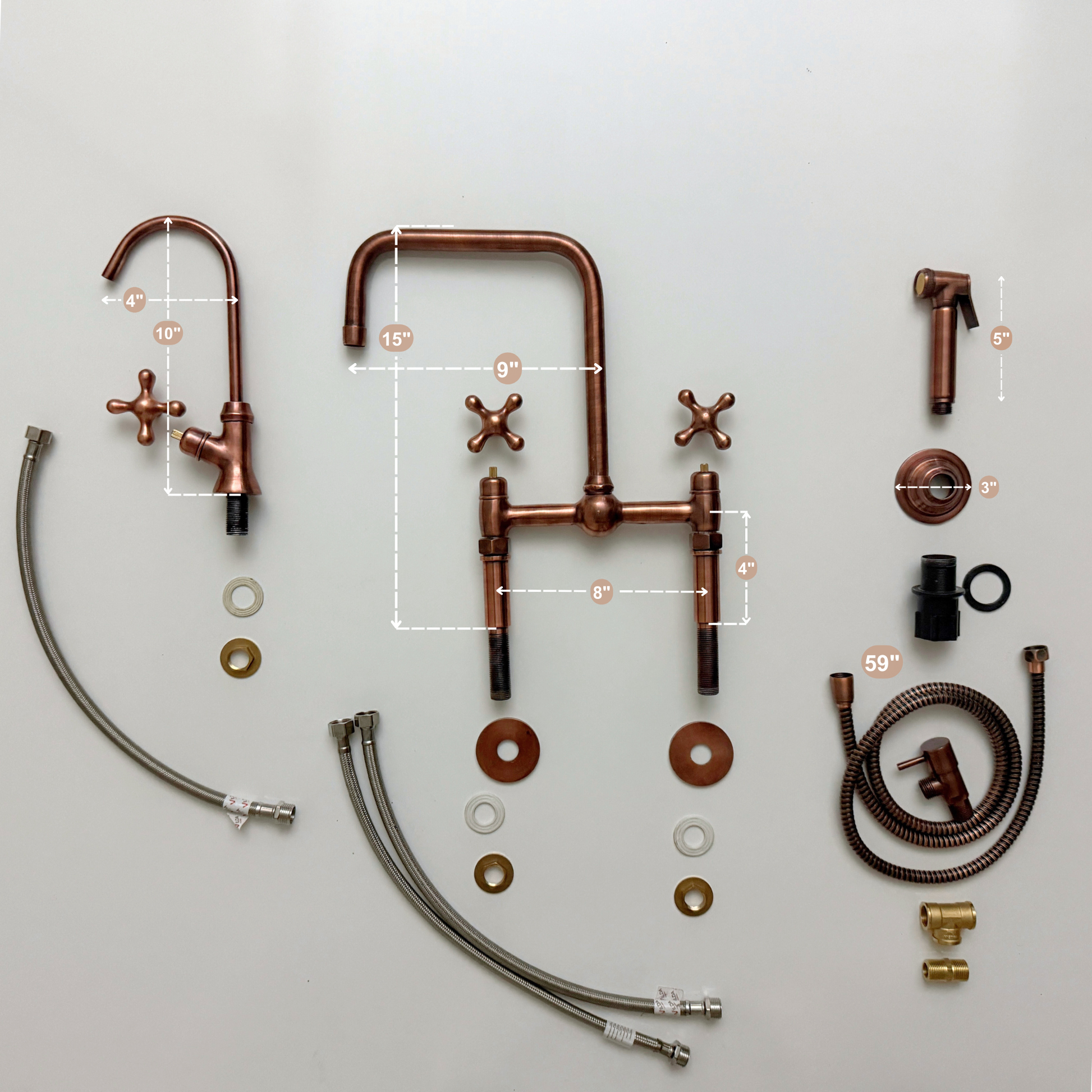 Antique Copper Classic Bridge Faucet with Ball Center, Straight Legs, Sprayer, Cold Water Faucet and Cross Handles
