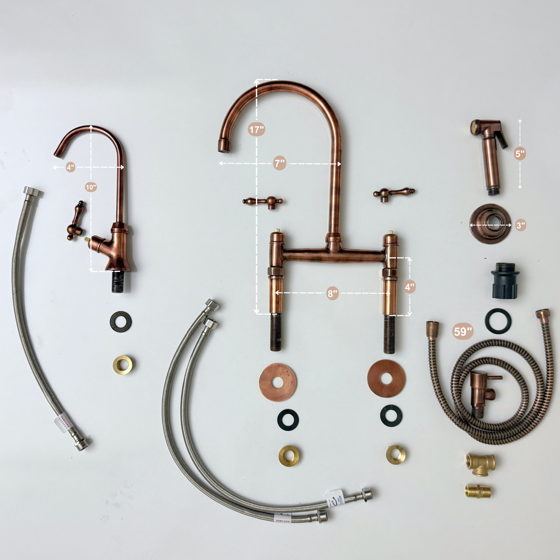 Antique Copper Kitchen Bridge Faucet with Sprayer, Cold Water Faucet and Lever Handles