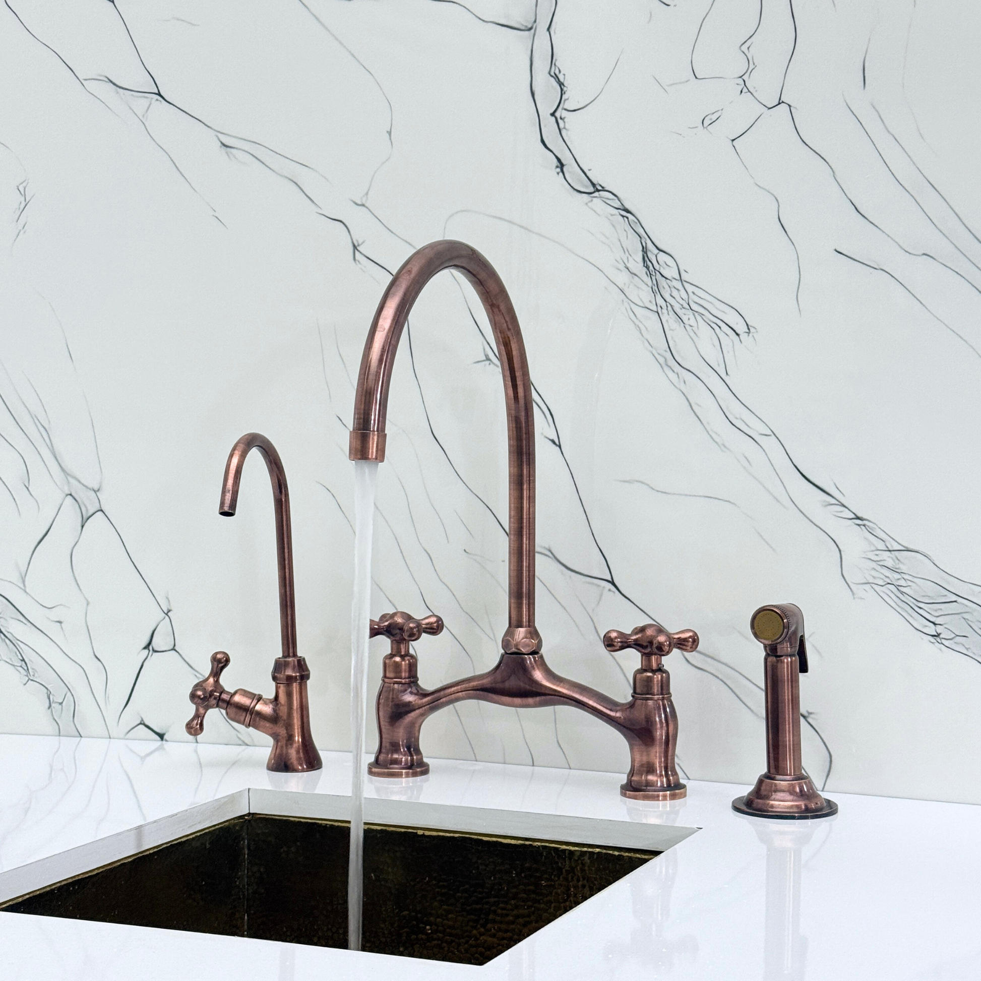 Kitchen Bridge Faucet in Antique Copper Finish blends traditional charm with modern utility. Featuring a striking antique copper finish over solid brass construction, it offers both durability and timeless character. A 360° swivel gooseneck spout with a 10" reach ensures full sink coverage. Designed for practical elegance, it includes a high-pressure side sprayer and a dedicated drinking water tap. Cross handles provide smooth water control, and the antique copper finish resists corrosion and elevates any kitchen aesthetic.