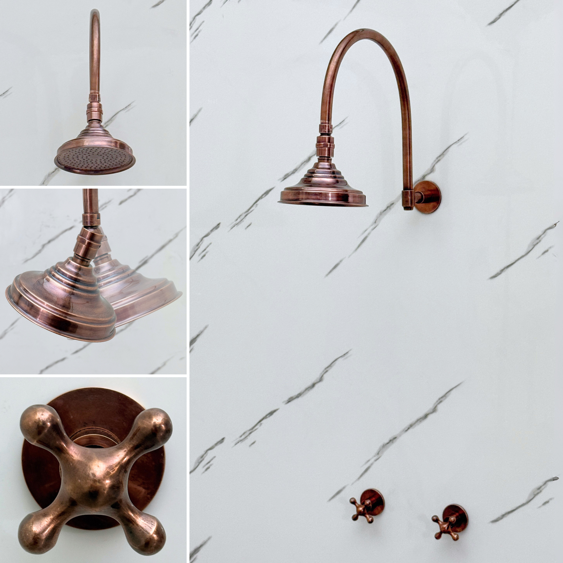 This wall-mounted shower system features a striking antique copper finish over solid brass construction, combining elegance with lasting durability. The arcuate arm supports a round rain shower head for a soothing rainfall effect, while the cross handles provide precise water control for an effortless and timeless shower experience. An optional Adjustable Shower Head Connector is available, allowing you to customize the shower angle for added comfort.