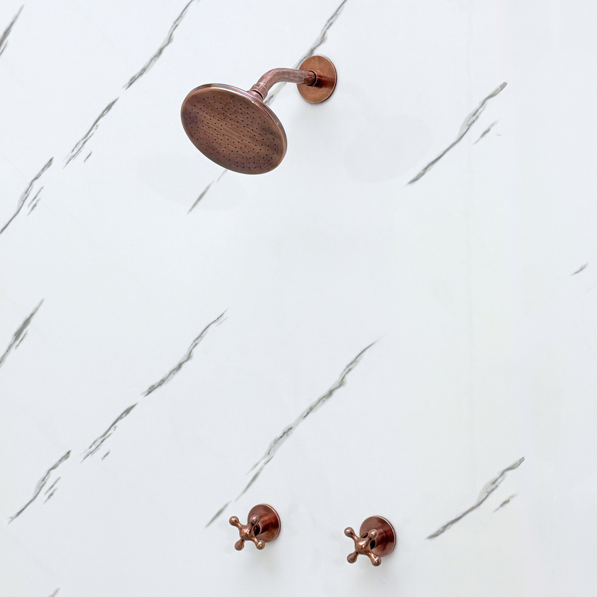 This wall-mounted shower system features a striking antique copper finish over solid brass construction, combining elegance with lasting durability. The brass arm supports a flat round rain shower head for a soothing rainfall effect, while the cross handles provide precise water control for an effortless and timeless shower experience. An Adjustable Shower Head Connector is included , allowing you to customize the shower angle for added comfort.