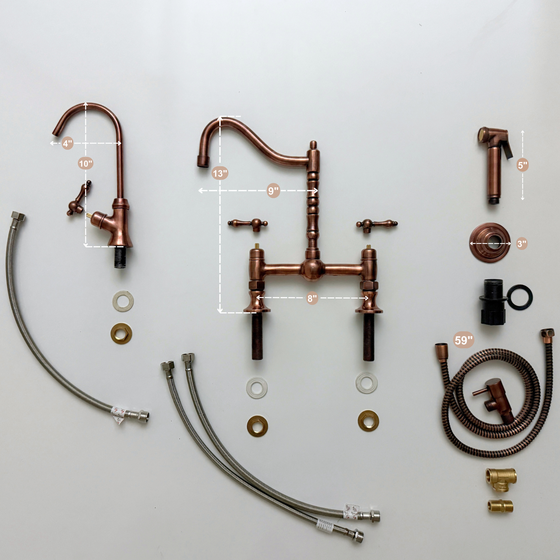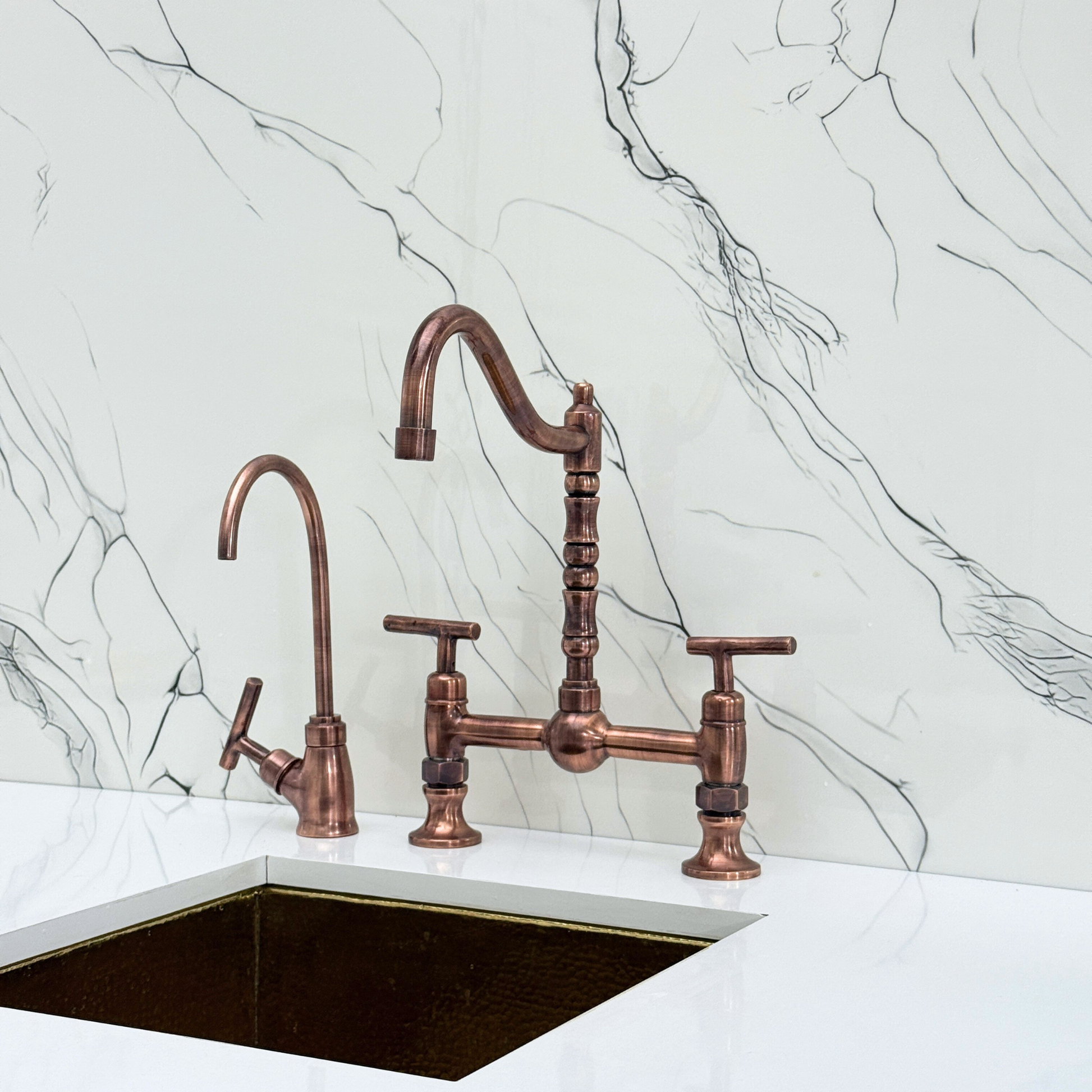 Victorian Kitchen Bridge Faucet with Ball Center in Antique Copper Finish blends traditional charm with modern utility. Featuring a striking antique copper finish over solid brass construction, it offers both durability and timeless character. The sculpted Victorian-style spout adds a timeless touch, echoing classic design traditions. The smooth ball center detail enhances visual symmetry and sophistication. A 360° swivel gooseneck spout ensures full sink coverage. Designed for practical elegance, it includes a high-pressure side sprayer and a dedicated drinking water tap. Lever handles provide smooth water control, and the antique copper finish resists corrosion and elevates any kitchen aesthetic.