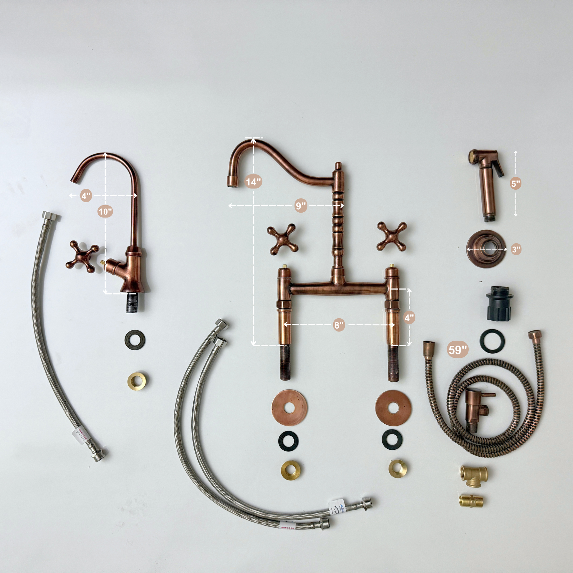 Victorian Kitchen Bridge Faucet with Straight Legs in Antique Copper Finish blends traditional charm with modern utility. Featuring a striking antique copper finish over solid brass construction, it offers both durability and timeless character. The sculpted Victorian-style spout adds a timeless touch, echoing classic design traditions. A 360° swivel gooseneck spout ensures full sink coverage. Designed for practical elegance, it includes a high-pressure side sprayer and a dedicated drinking water tap. Cross handles provide smooth water control, and the antique copper finish resists corrosion and elevates any kitchen aesthetic.