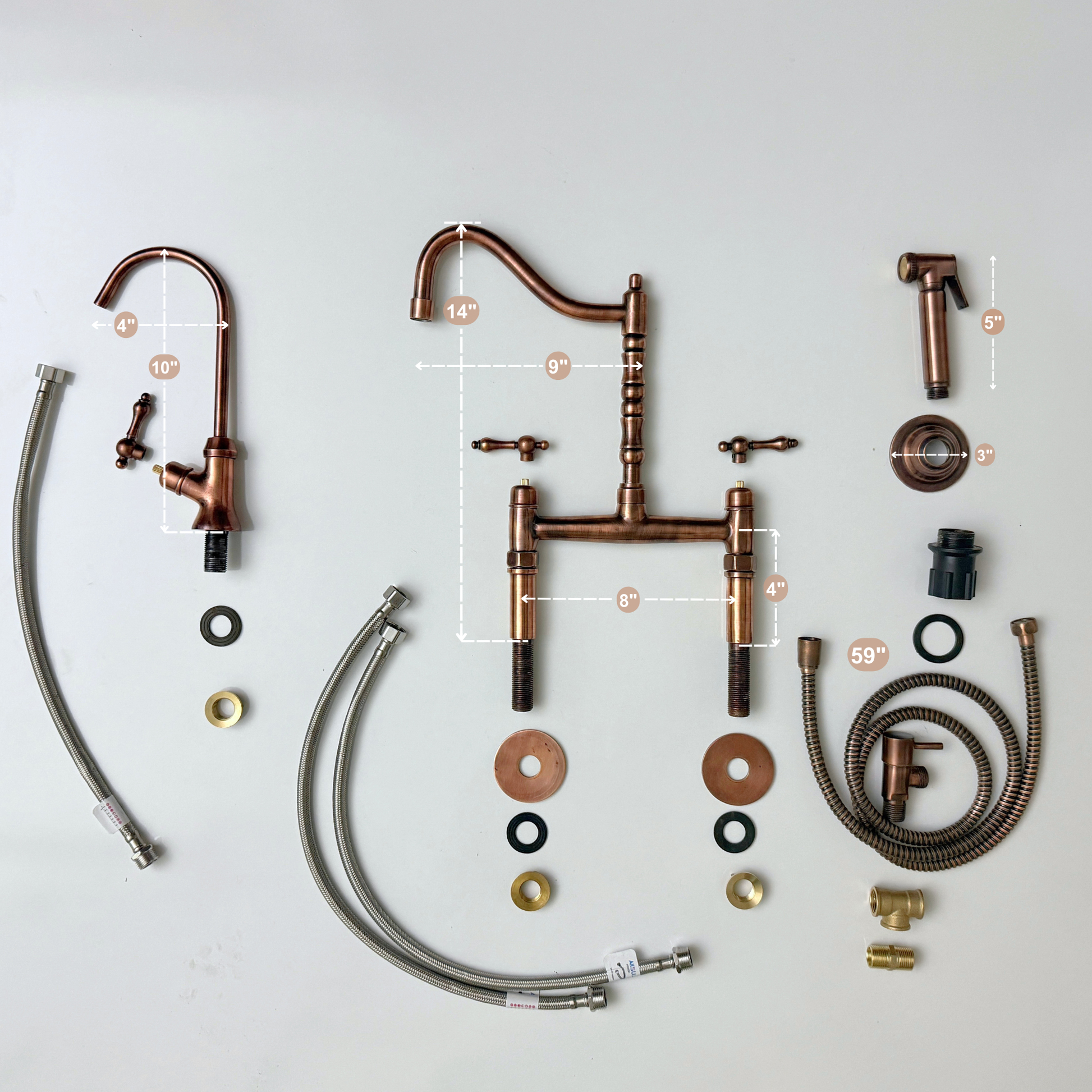 Victorian Kitchen Bridge Faucet with Straight Legs in Antique Copper Finish blends traditional charm with modern utility. Featuring a striking antique copper finish over solid brass construction, it offers both durability and timeless character. The sculpted Victorian-style spout adds a timeless touch, echoing classic design traditions. A 360° swivel gooseneck spout ensures full sink coverage. Designed for practical elegance, it includes a high-pressure side sprayer and a dedicated drinking water tap. Lever handles provide smooth water control, and the antique copper finish resists corrosion and elevates any kitchen aesthetic.