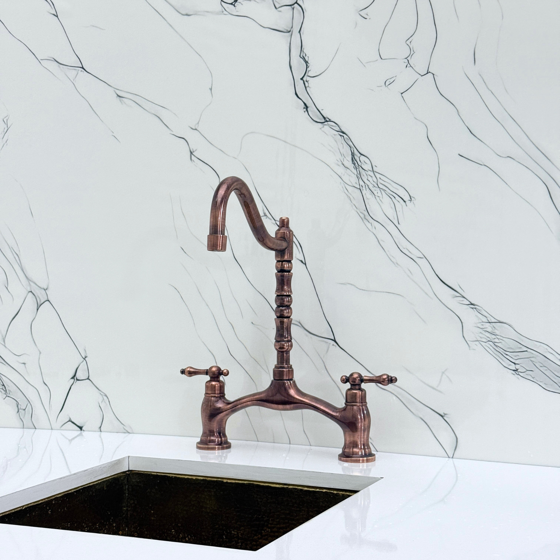 Victorian Kitchen Bridge Faucet in Antique Copper Finish blends traditional charm with modern utility. Featuring a striking antique copper finish over solid brass construction, it offers both durability and timeless character. The sculpted Victorian-style spout adds a timeless touch, echoing classic design traditions. A 360° swivel gooseneck spout ensures full sink coverage. Designed for practical elegance, it includes a high-pressure side sprayer and a dedicated drinking water tap. Lever handles provide smooth water control, and the antique copper finish resists corrosion and elevates any kitchen aesthetic.