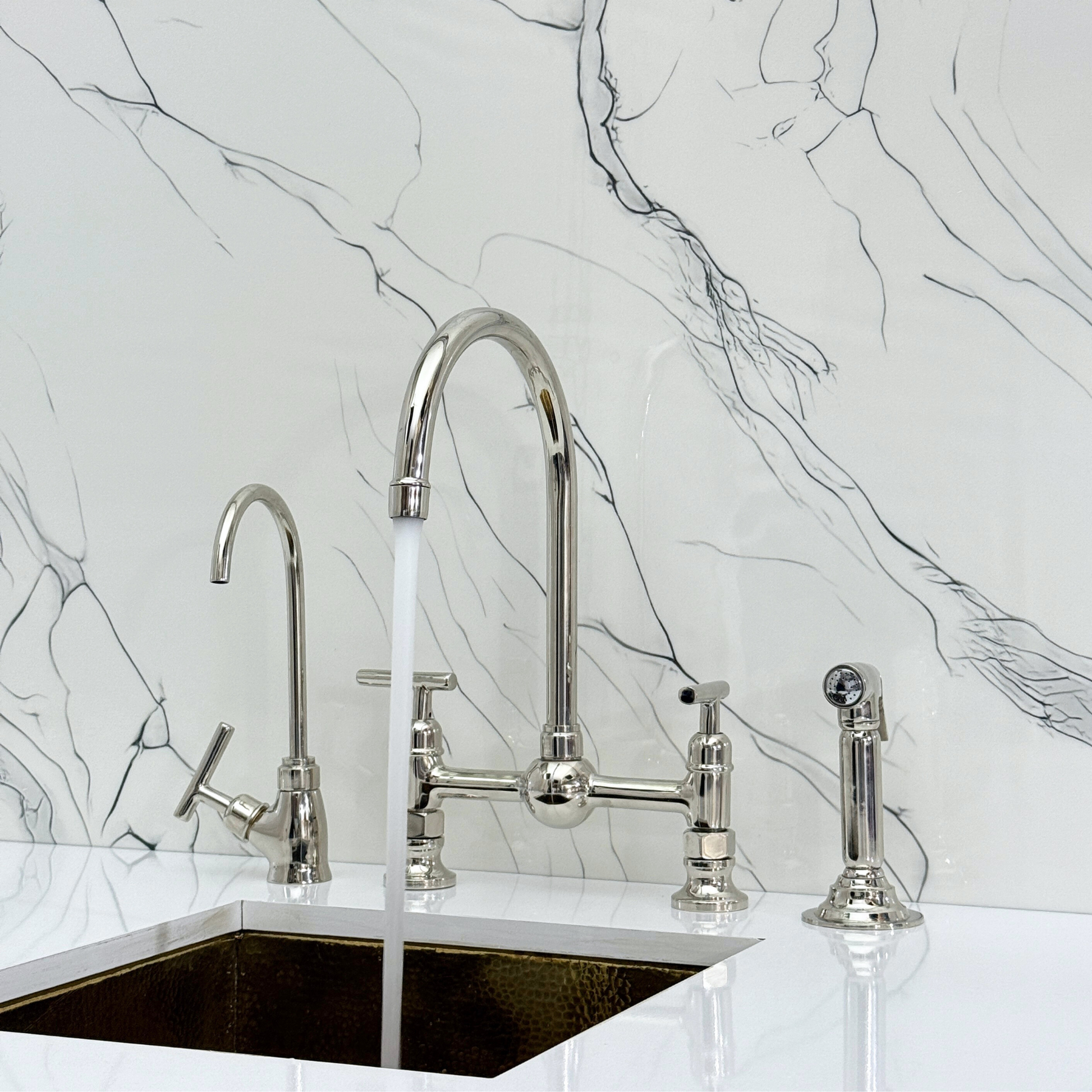 Kitchen Bridge Faucet with Ball Center in Polished Nickel Finish blends traditional charm with modern utility. Featuring a striking a polished nickel finish over solid brass construction, it offers both durability and timeless character. The smooth ball center detail enhances visual symmetry and sophistication. A 360° swivel gooseneck spout ensures full sink coverage. Designed for practical elegance, it includes a high-pressure side sprayer and a dedicated drinking water tap. Lever handles provide smooth water control, and the polished nickel finish resists corrosion and elevates any kitchen aesthetic.