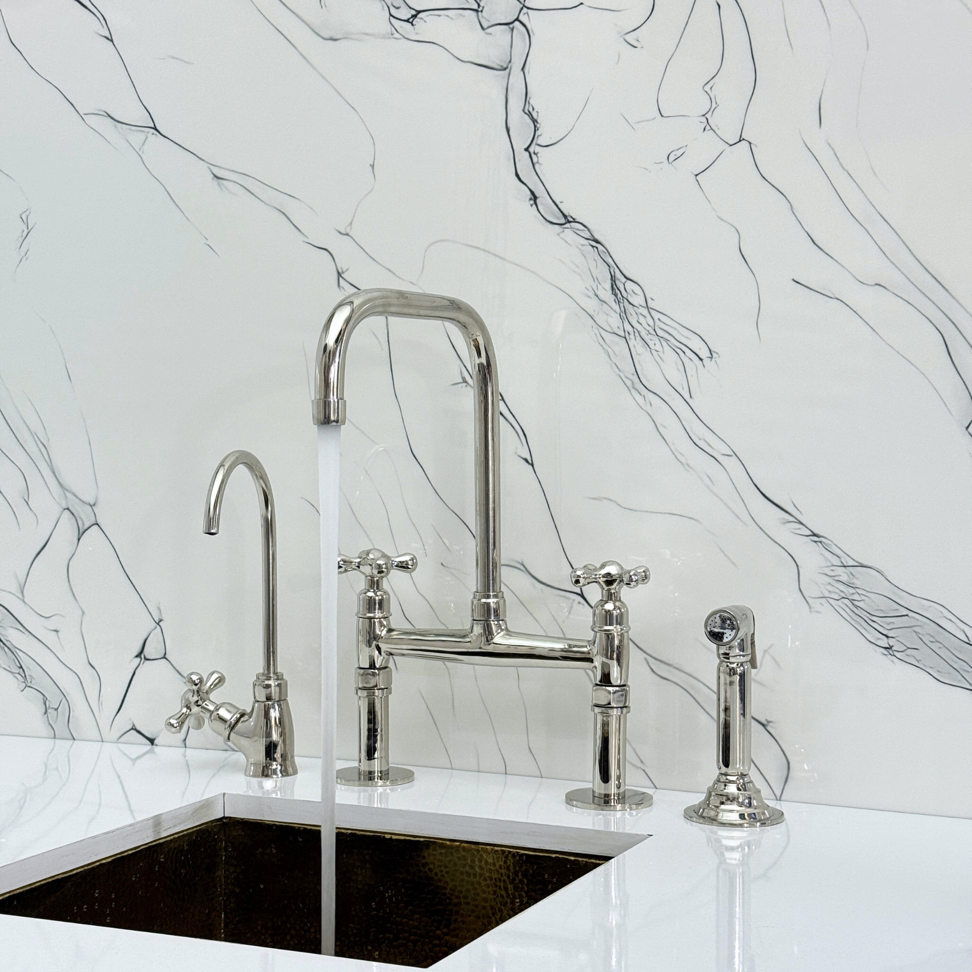 Classic Kitchen Bridge Faucet with Straight Legs in Polished Nickel Finish blends traditional charm with modern utility. Featuring a striking polished nickel finish over solid brass construction, it offers both durability and timeless character. A 360° swivel gooseneck spout ensures full sink coverage. Designed for practical elegance, it includes a high-pressure side sprayer and a dedicated drinking water tap. Cross handles provide smooth water control, and the polished nickel finish resists corrosion and elevates any kitchen aesthetic.