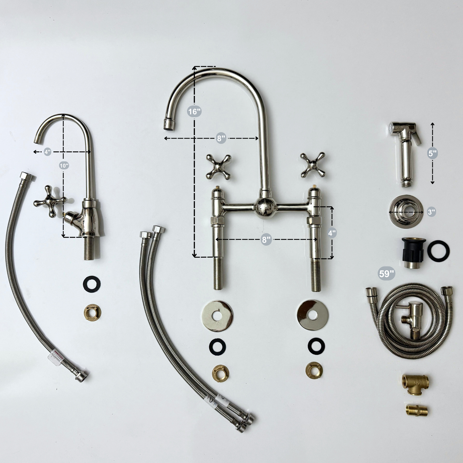 Polished Nickel Kitchen Bridge Faucet with Ball Center, Sprayer, Cold Water Faucet, Straight Legs and Cross Handles