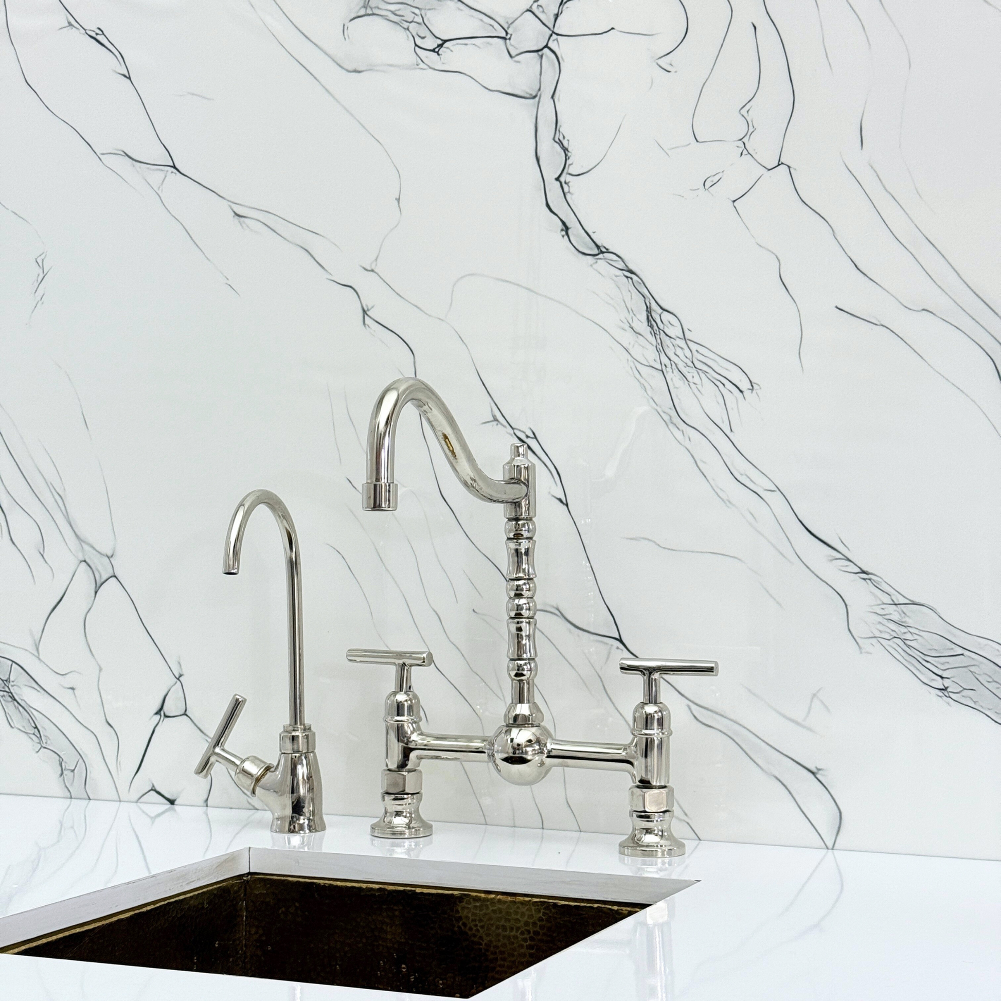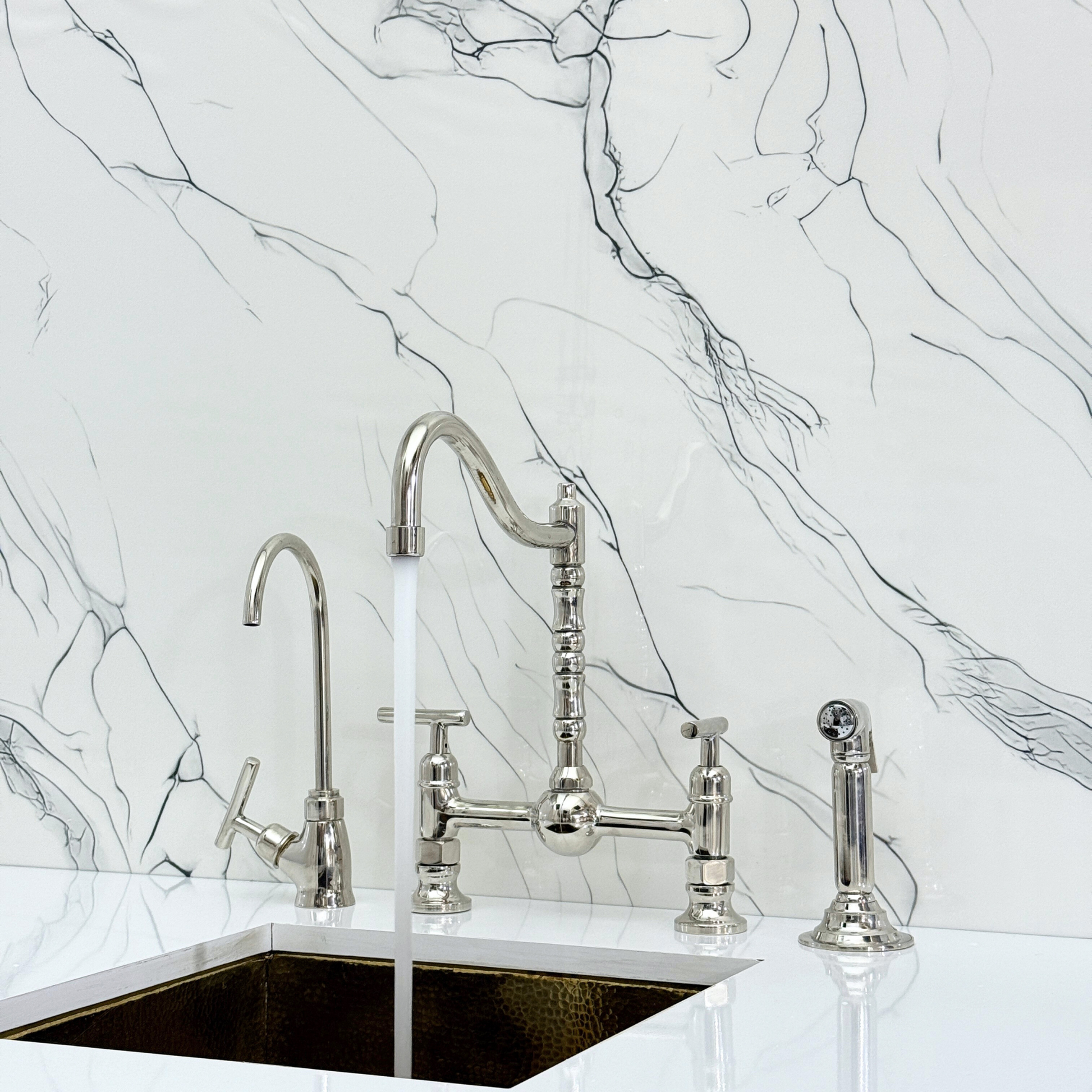 Victorian Kitchen Bridge Faucet with Ball Center in Polished Nickel Finish blends traditional charm with modern utility. Featuring a striking polished nickel finish over solid brass construction, it offers both durability and timeless character. The sculpted Victorian-style spout adds a timeless touch, echoing classic design traditions. The smooth ball center detail enhances visual symmetry and sophistication. A 360° swivel gooseneck spout ensures full sink coverage. Designed for practical elegance, it includes a high-pressure side sprayer and a dedicated drinking water tap. Lever handles provide smooth water control, and the polished nickel finish resists corrosion and elevates any kitchen aesthetic.