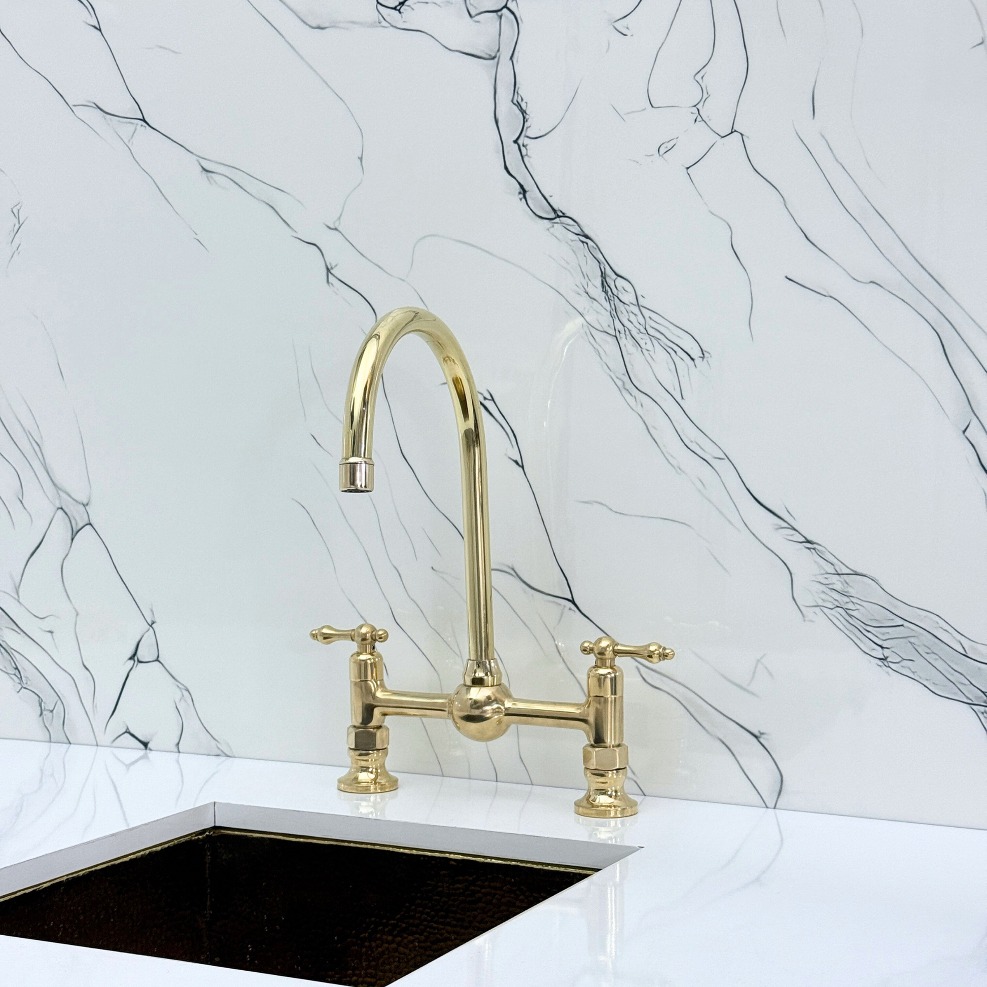 Unlacquered brass bridge kitchen faucet brings together artisanal quality and everyday performance, tailored for kitchens that value both beauty and reliability. The smooth ball center detail enhances visual appeal, adding balance and sophistication to the design. Crafted from premium solid brass, it features a natural unlacquered finish that develops a graceful patina over time. A 360° swivel gooseneck spout ensures full sink coverage and elegant movement. Designed with a dedicated drinking water tap and a high-pressure side sprayer, this set delivers full performance in a refined form. Lever handles ensure easy water control, while the faucet remains durable, corrosion-resistant, and simple to install and maintain.