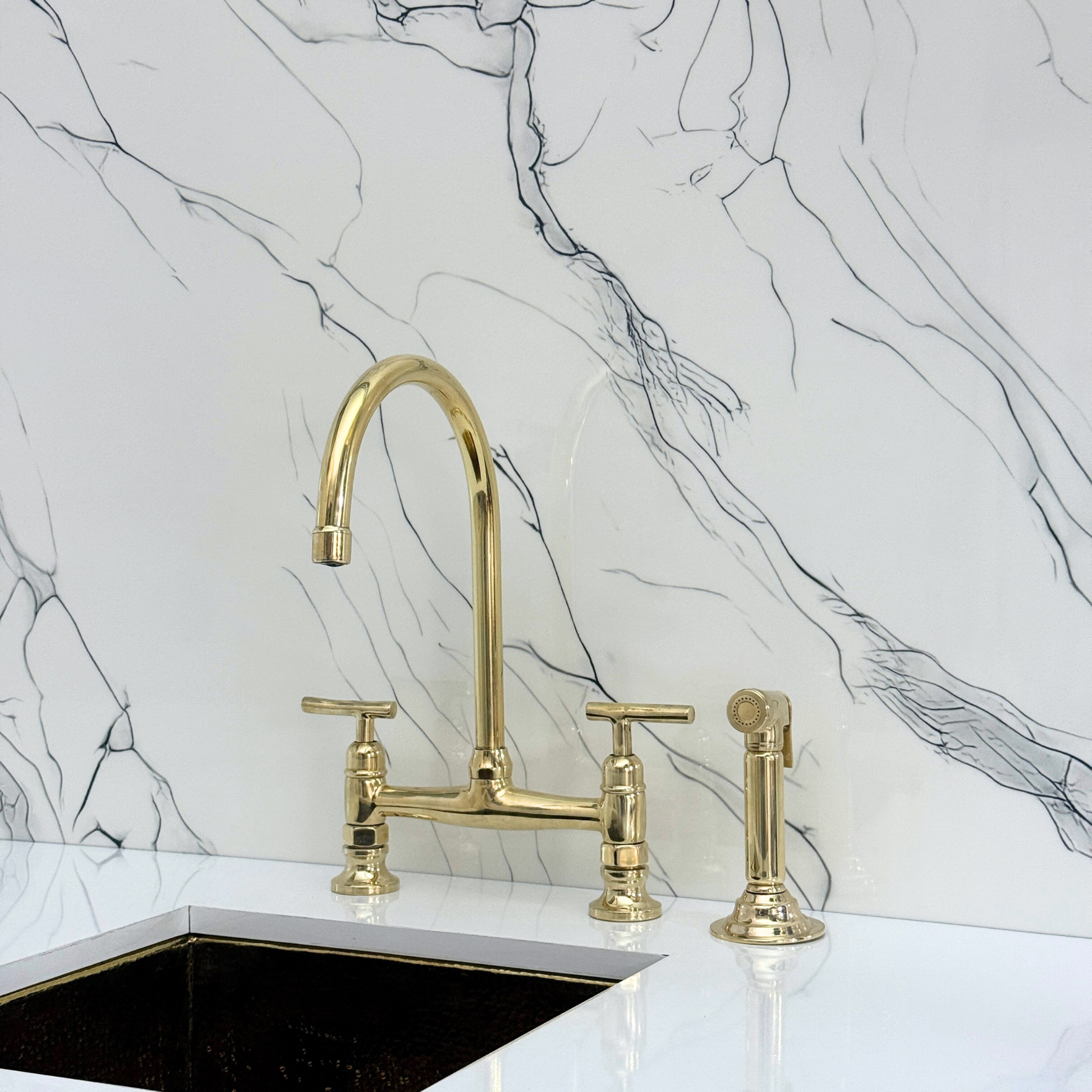 Unlacquered brass bridge vintage kitchen faucet brings together artisanal quality and everyday performance, tailored for kitchens that value both beauty and reliability. Crafted from premium solid brass, it features a natural unlacquered finish that develops a graceful patina over time. A 360° swivel gooseneck spout ensures full sink coverage and elegant movement. Designed with a dedicated drinking water tap and a high-pressure side sprayer, this set delivers full performance in a refined form. Lever handles ensure easy water control, while the faucet remains durable, corrosion-resistant, and simple to install and maintain.