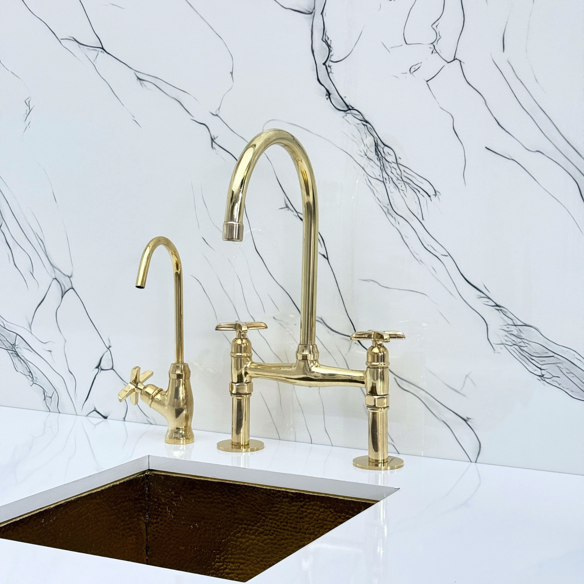 Unlacquered Brass Bridge Kitchen Faucet with Sprayer, Drinking Water Tap and Cross Handles