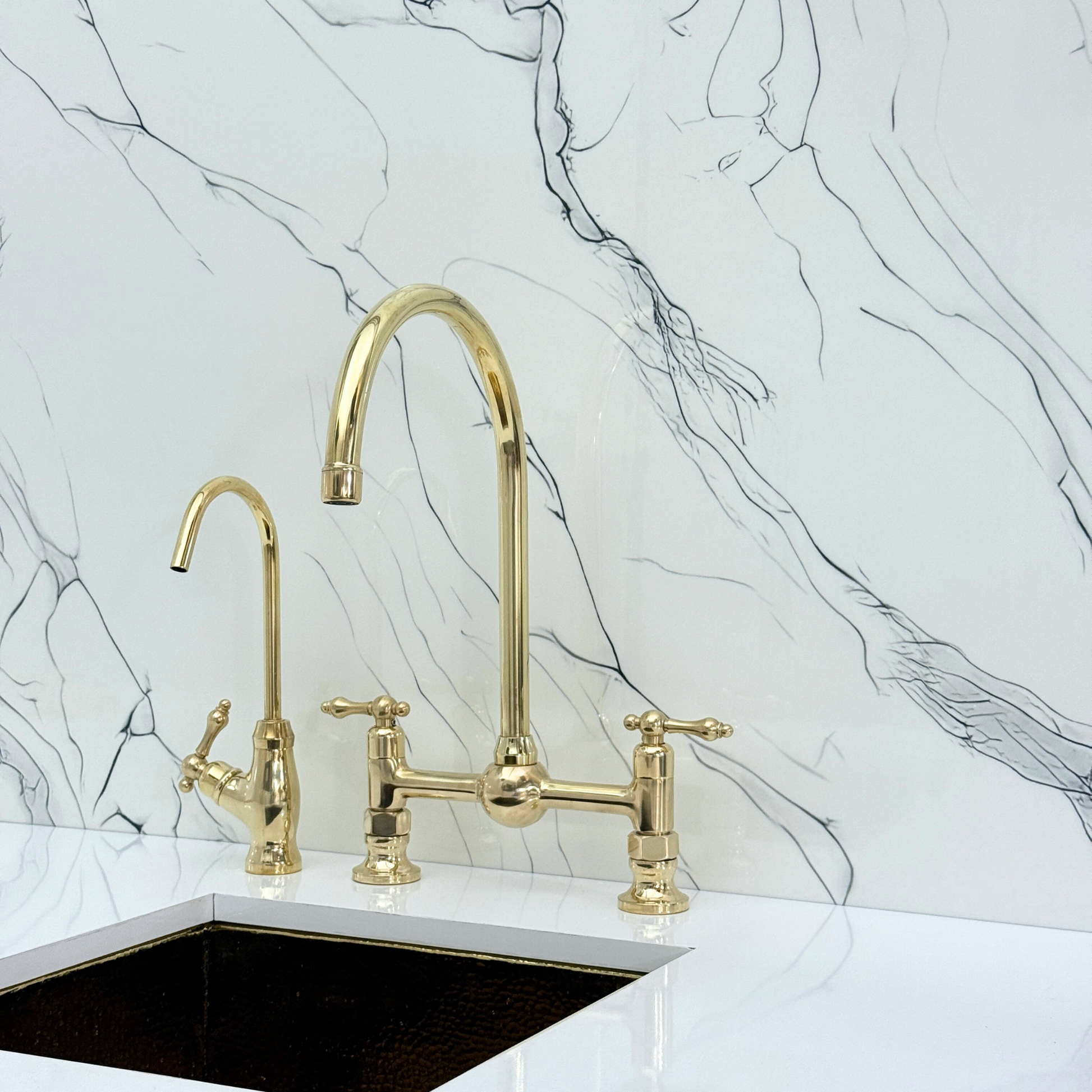 Unlacquered brass bridge vintage kitchen faucet brings together artisanal quality and everyday performance, tailored for kitchens that value both beauty and reliability. The smooth ball center detail enhances visual appeal, adding balance and sophistication to the design. Crafted from premium solid brass, it features a natural unlacquered finish that develops a graceful patina over time. A 360° swivel gooseneck spout ensures full sink coverage and elegant movement. Designed with a dedicated drinking water tap and a high-pressure side sprayer, this set delivers full performance in a refined form. Lever handles ensure easy water control, while the faucet remains durable, corrosion-resistant, and simple to install and maintain.
