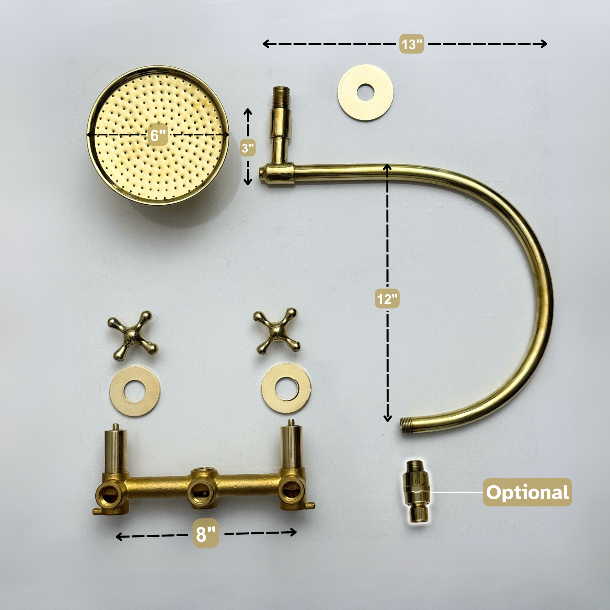 Unlacquered Brass shower system crafted from premium solid brass. Featuring a natural unlacquered finish that develops a graceful patina over time, this wall-mounted shower set combines elegance and durability. The arcuate arm supports a round rain shower head for a soothing rainfall effect, while the cross handles provide precise water control for an effortless and timeless shower experience. An optional Adjustable Shower Head Connector is available, allowing you to customize the shower angle for added comfort.