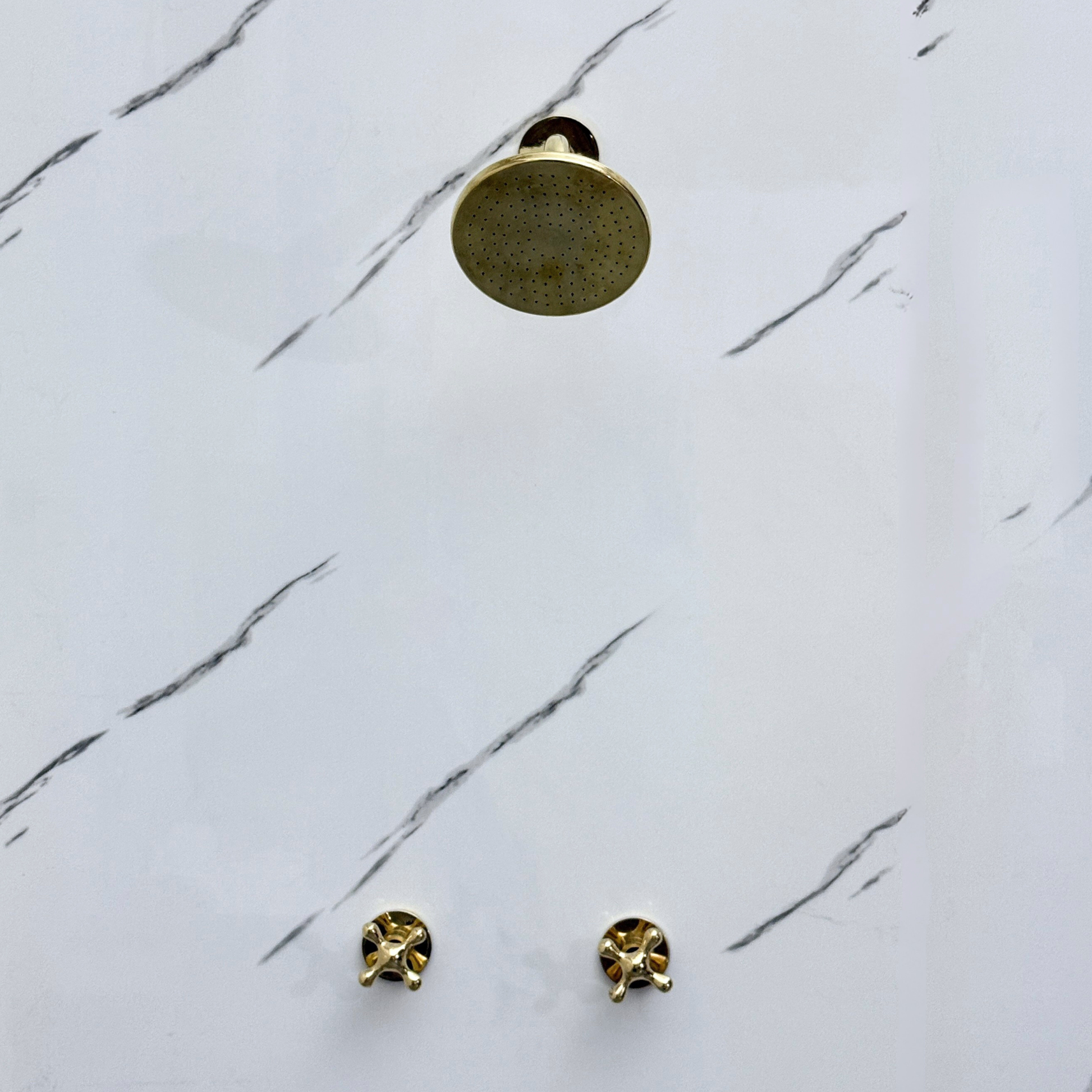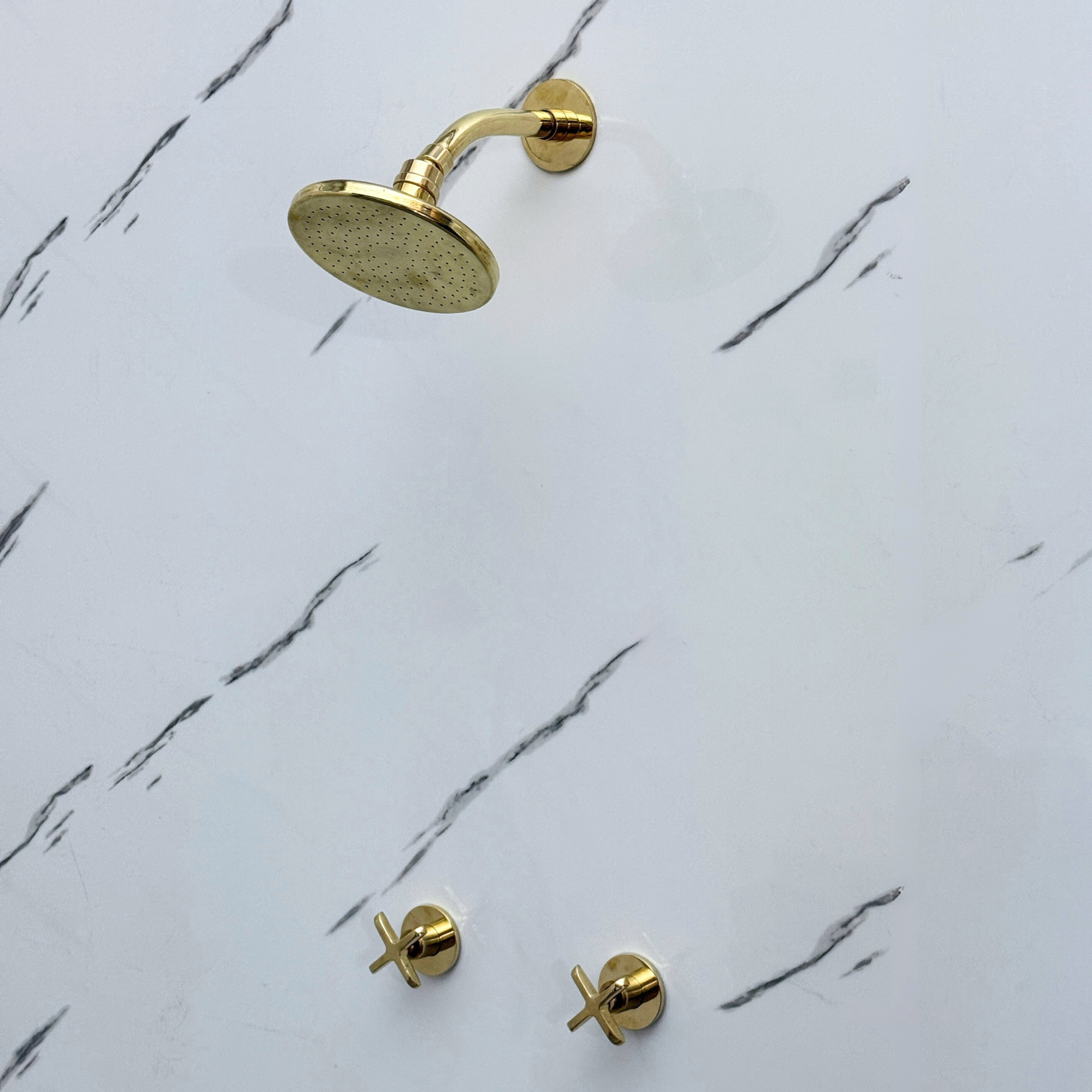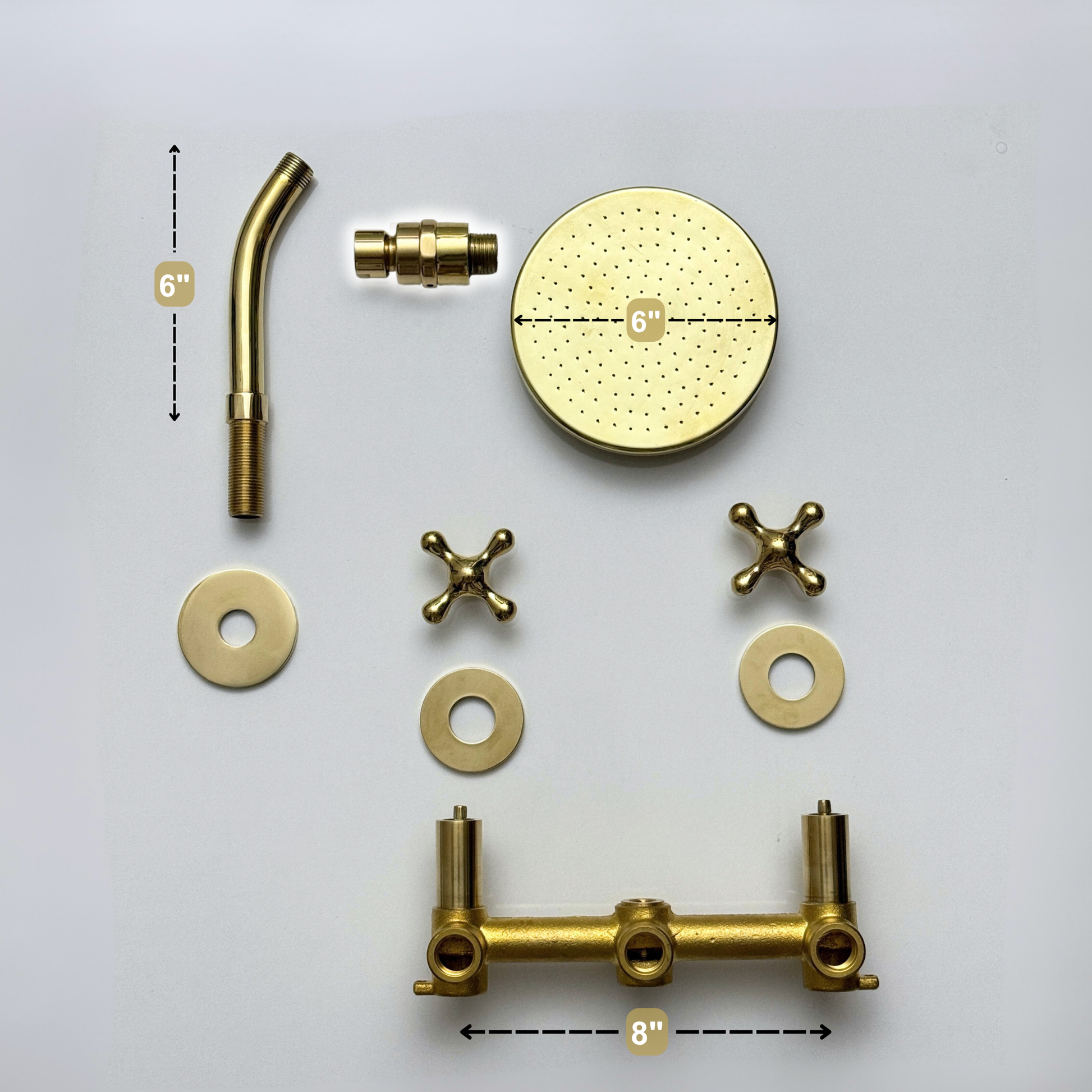 Unlacquered Brass shower system crafted from premium solid brass. Featuring a natural unlacquered finish that develops a graceful patina over time, this wall-mounted shower set combines elegance and durability. The brass arm supports a flat round rain shower head for a soothing rainfall effect, while the cross handles provide precise water control for an effortless and timeless shower experience. An Adjustable Shower Head Connector is included , allowing you to customize the shower angle for added comfort.