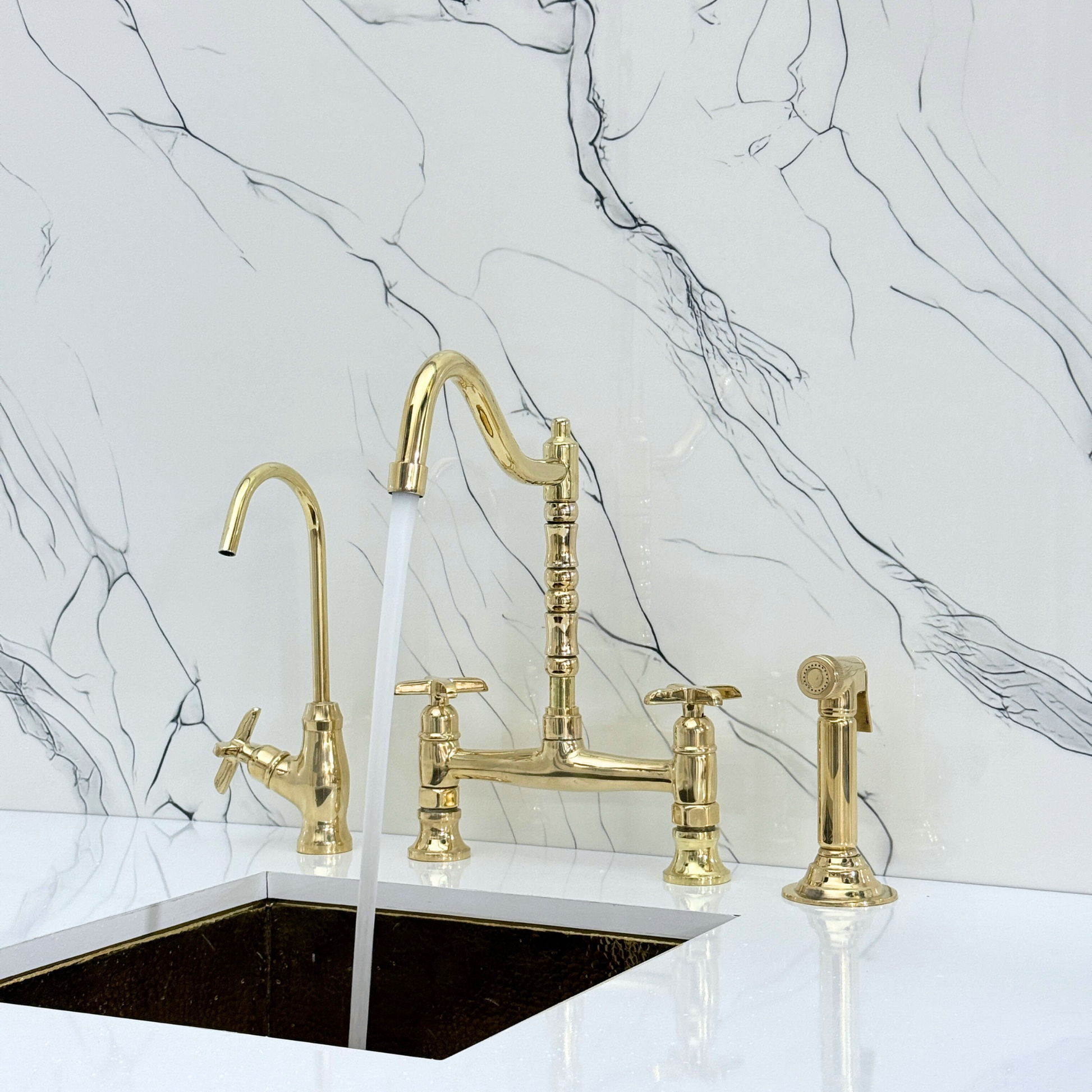 Unlacquered Brass Victorian Bridge Faucet brings together artisanal quality and everyday performance, tailored for kitchens that value both beauty and reliability. The sculpted Victorian-style spout adds a timeless touch, echoing classic design traditions. Crafted from premium solid brass, it features a natural unlacquered finish that develops a graceful patina over time. A 360° swivel gooseneck spout ensures full sink coverage and elegant movement. Designed with a dedicated drinking water tap and a high-pressure side sprayer, this set delivers full performance in a refined form. Cross handles ensure easy water control, while the faucet remains durable, corrosion-resistant, and simple to install and maintain.